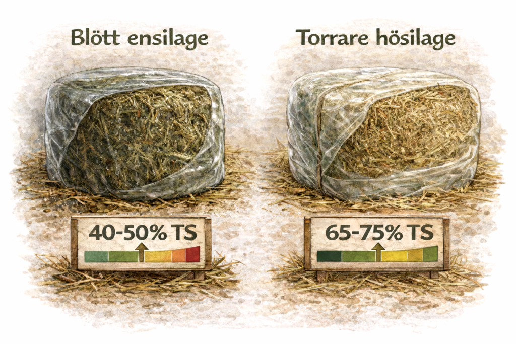 Ett ensilage eller hösilage hamnar ofta mitt emellan, runt 50–65 % TS. Där är ungefär hälften vatten och hälften torrsubstans.